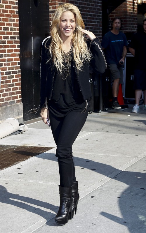 Make way from a promotional obligation to the next, Shakira was spotted arriving at "Late Show with David Letterman" on Thursday afternoon (September 23). Dressed in all black ensembles, "Waka Waka" singer happily waved to fans and posed for pictures before heading into the Ed Sullivan Theatre for her sit-down interview with Dave. The song will be featured on Shakira's upcoming album "Sale or Sole as published next month.